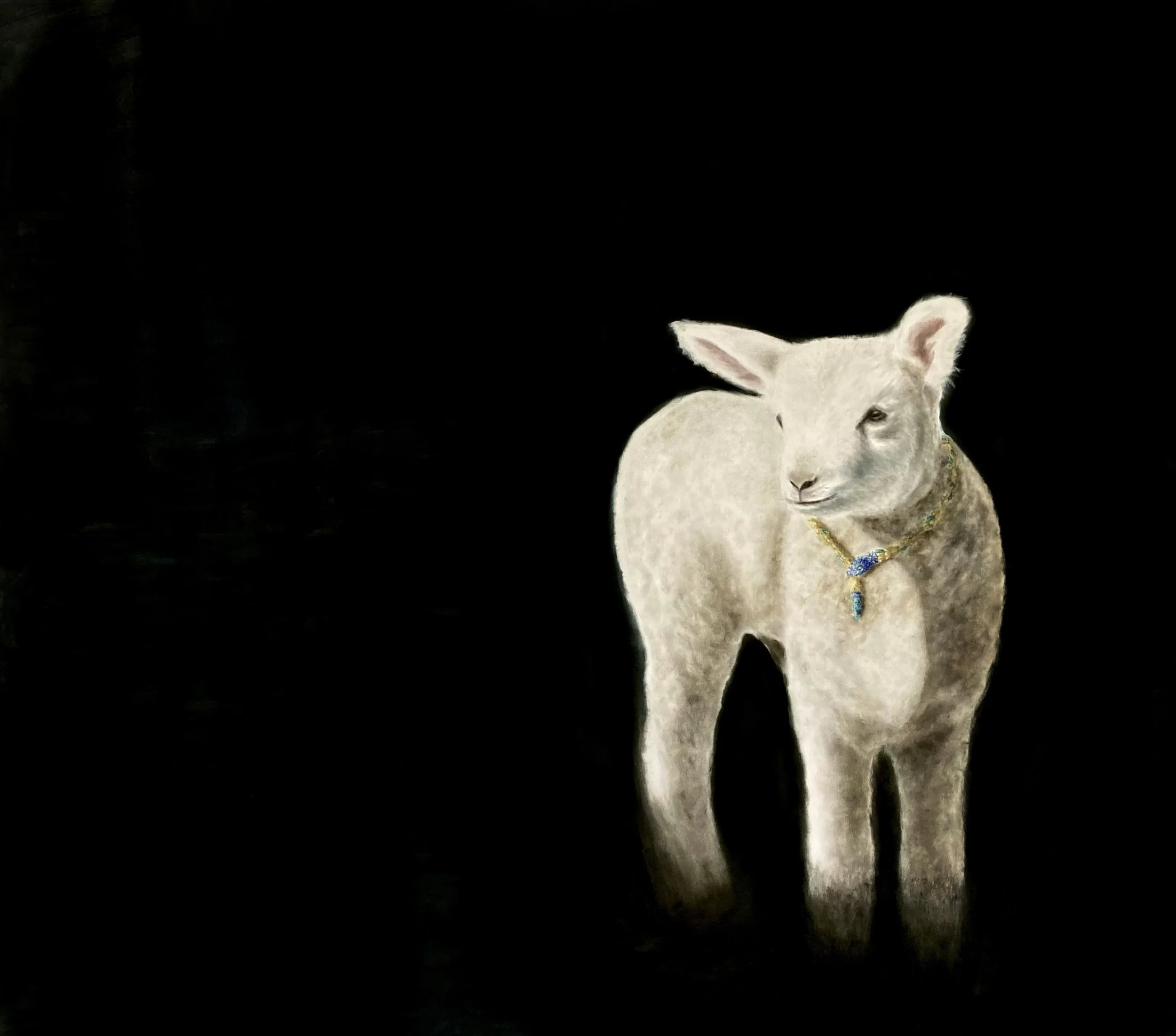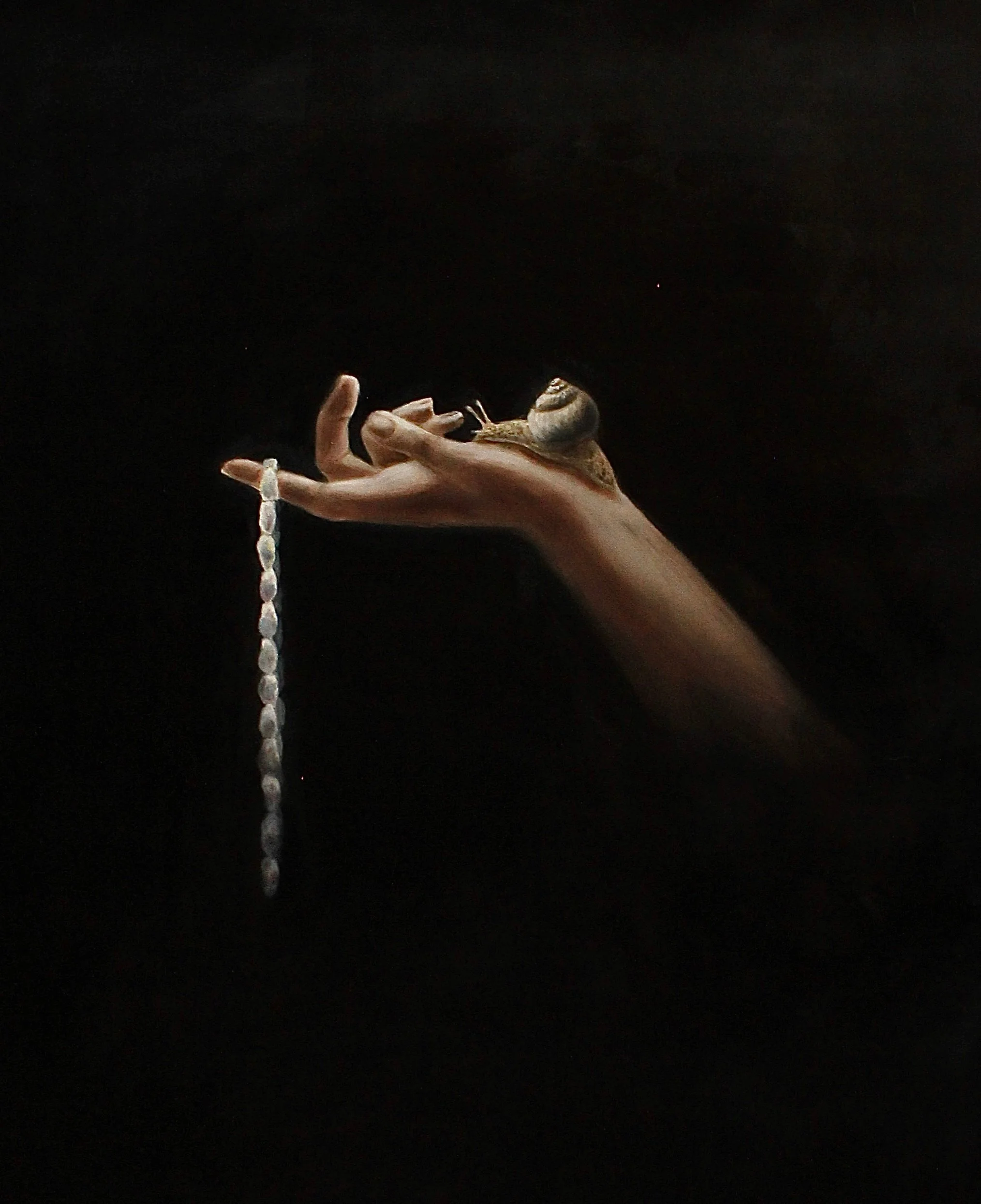 Animali e gioielli. La lussuria il tema principale di queste tele. Uno stambecco si appropria di una perla, ognuno di noi vorrebbe afferrare quel corno e rubare il gioiello. Vorremmo appropriarci di questi gioielli. Di ciò che non è nostro. Vorremmo rincorrere un agnello per poter strappare la collana di smeraldi, che diventi nostra, per poterla mettere in mostra. O rubare le uova di quel nido, delle uova di Fabergé, così belle, tutte d’oro e diamanti. Senza però renderci conto che non potremmo mai nutrirci di ciò che contengono.